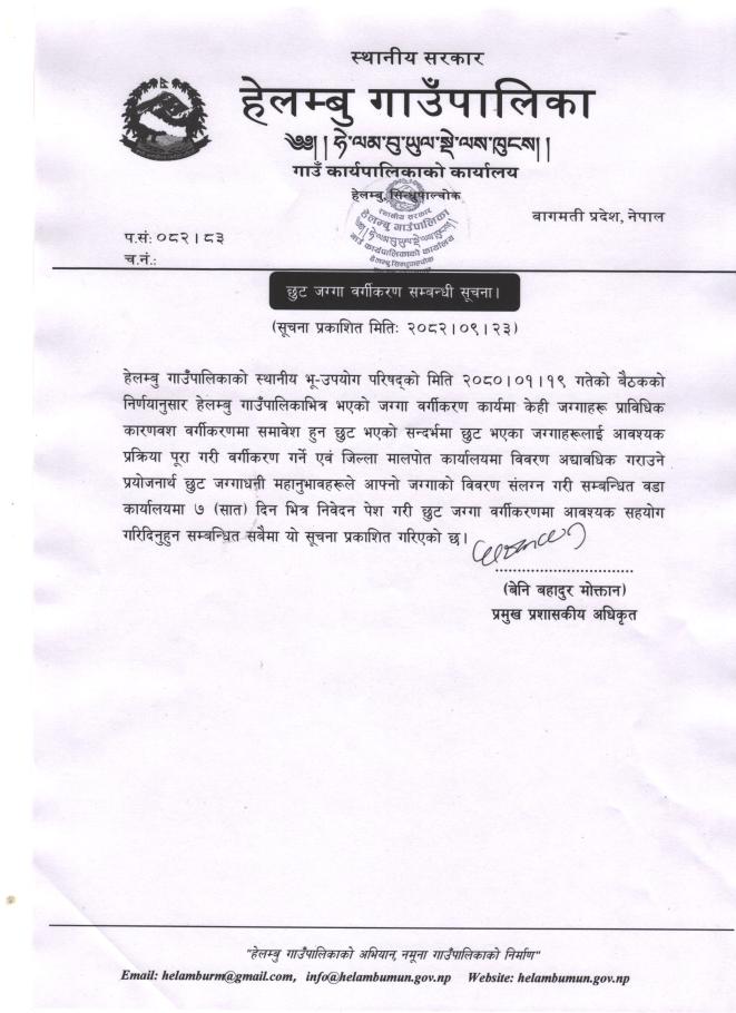 छुट जग्गा वर्गीकरण सम्बन्धी सूचना