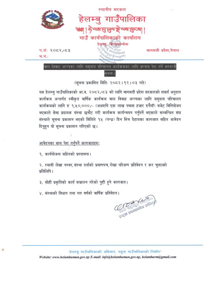 बाल विवाह अन्त्यका लागि समुदाय परिचालन कार्यक्रमका लागि प्रस्ताव पेश गर्ने सम्बन्धी सूचना।