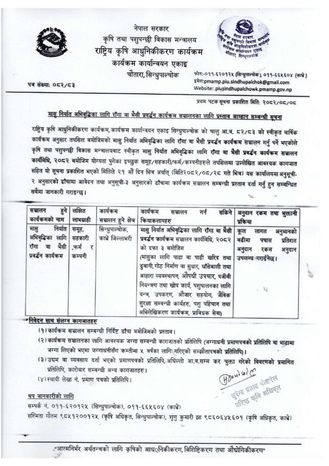 मासु निर्यात अभिवृद्धिका लागि राँगा वा भैसी प्रवर्द्धन कार्यक्रम सञ्चालनका लागि प्रस्ताव आव्हान सम्बन्धी सूचना।