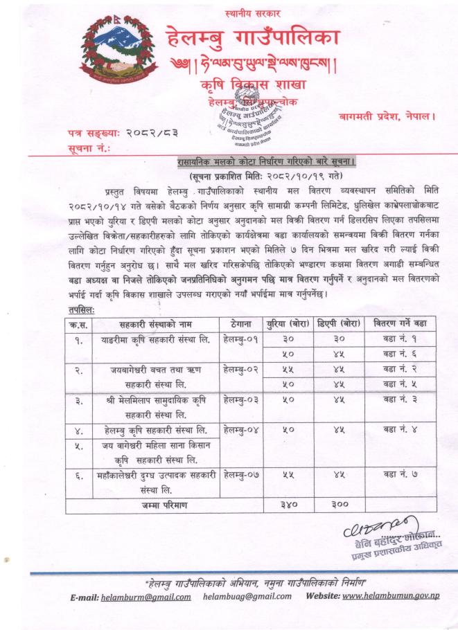 रासायनिक मलको कोटा निर्धारण गरिएको बारे सूचना।
