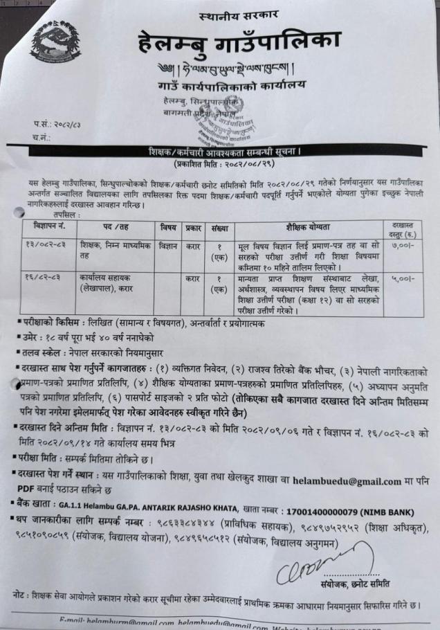 शिक्षक/ कर्मचारी आवश्यकता सम्बन्धी सूचना।
