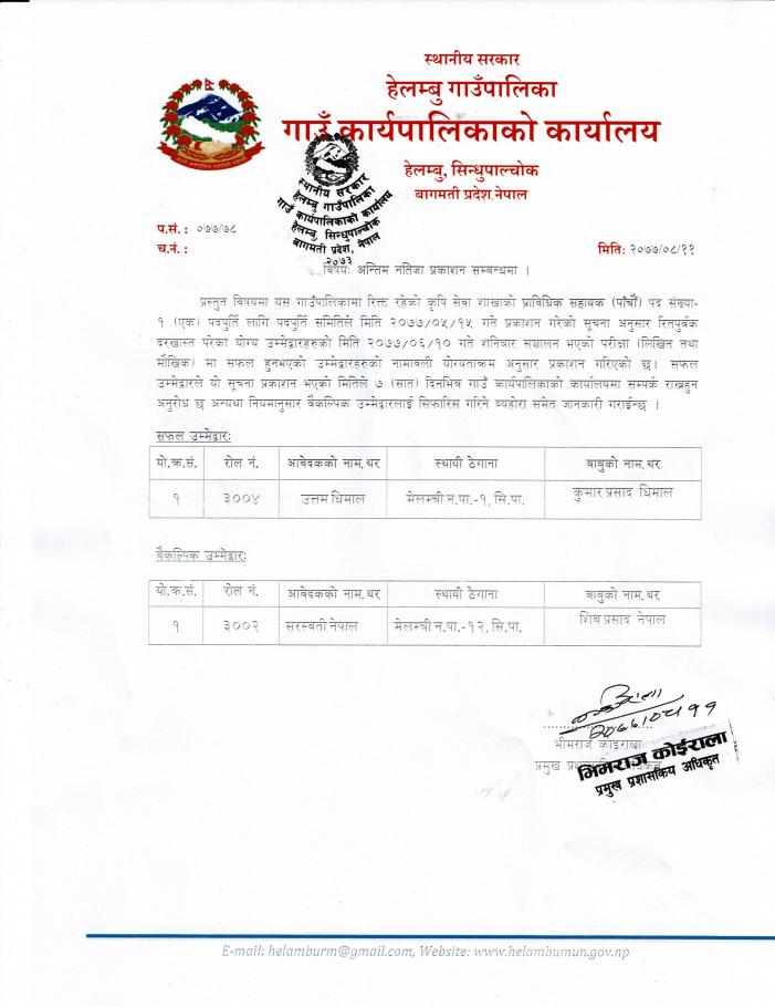 अन्तिम नतिजा प्रकाशन सम्बन्धमा । (कृषि शाखा प्राविधिक सहायक)
