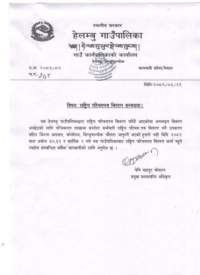 राष्ट्रिय परिचयपत्र वितरण सम्बन्धमा