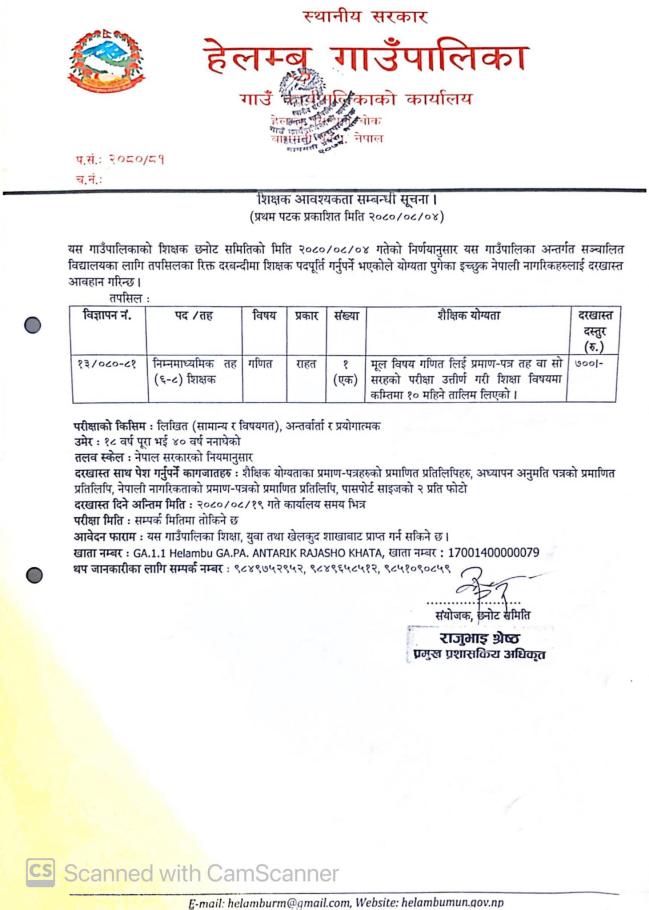 शिक्षक आवश्यकता सम्बन्धी सूचना