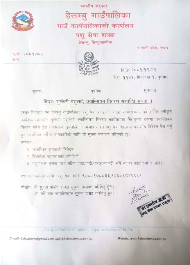 सुत्केरी पशुलाई क्याल्सियम वितरण सम्बन्धी सूचना।